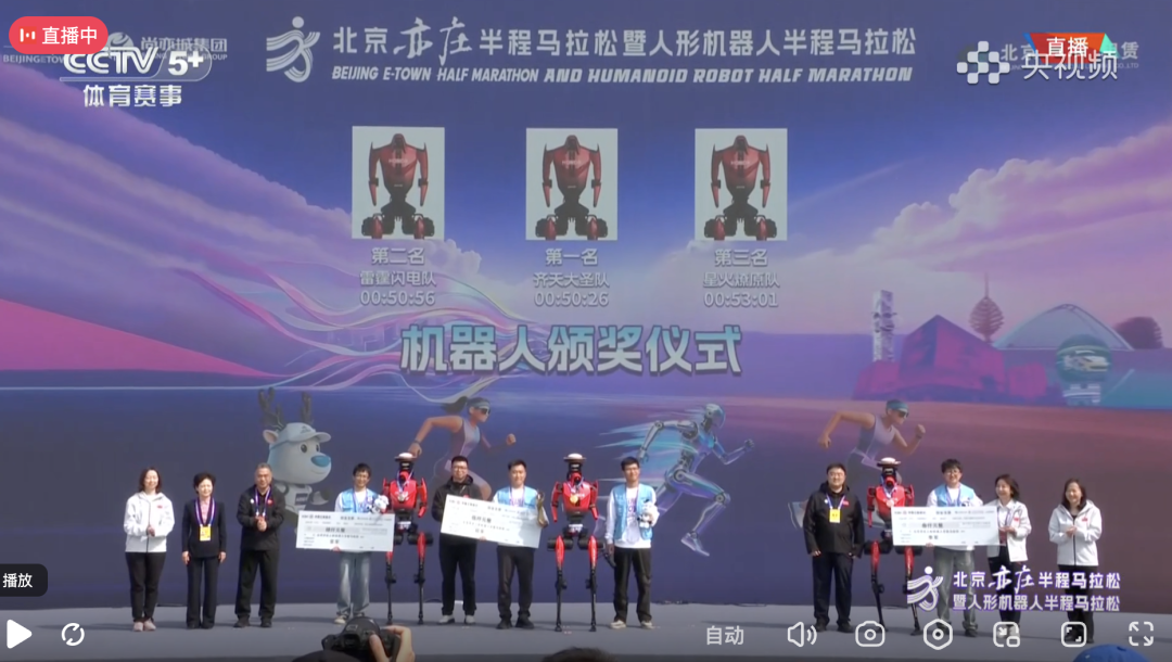 4月19日,在全球首个人形机器人马拉松品牌赛事——2026北京亦庄人形机器人半程马拉松赛场上,齐天大圣队的“闪电”机器人凭借50分26秒(净用时)的成绩获得冠军,超越了目前57分20秒的人类半程马拉松纪录。