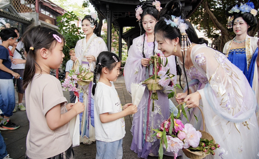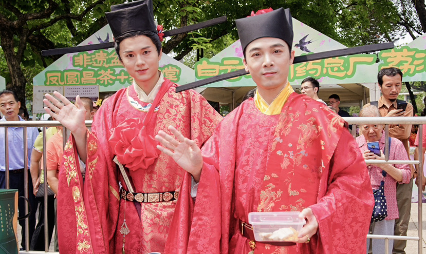 三月三当天下午,两场NPC游园活动让荔湾湖环湖步道化作解压放松的互动空间,身着古装的NPC“苏东坡”随机邀游客对诗,游客答对可获“解压符”,“芍药仙子”手提花篮,向游客赠花,清代泮塘进士“黄其表”,则为备考学子送上“顺利上岸”的祝福。