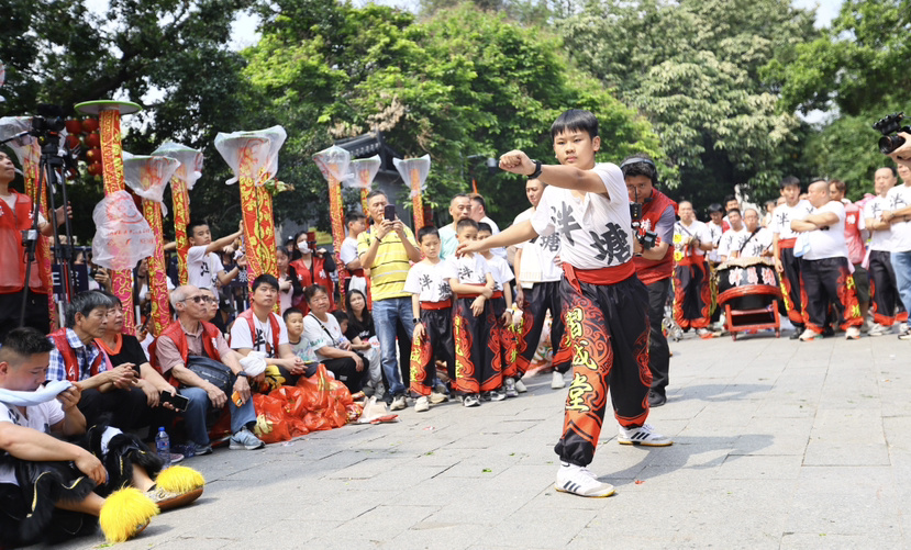 4月19日上午,按照习俗,泮塘村民选好吉时,抬着整只烧猪,一路敲锣打鼓、醒狮来到仁威庙祈福,吸引群众围观。其中一支醒狮队来自有着百余年历史的泮塘习成堂。习成堂由泮塘乡绅于清咸丰年间延请教头设立,主要向村民传授武术,更有醒狮和彩龙的传统,每年三月三,习成堂的彩龙和醒狮都会舞到仁威庙参拜祈福。随后,村中长老们一起为醒狮点睛、切烧猪,祈愿风调雨顺、福泽绵长。