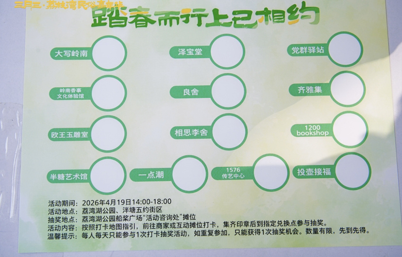 今年活动方联合泮塘五约街区内手作工坊、茶空间、文创小店等商户,推出“上巳寻宝”主题探索线路。游客领取集章地图,按照指引走进巷子深处,途径各种特色小店,捏一个“五秀”挂件,猜一道三月三谜题,配一包应季草本香包……集满印章后可兑换神秘节庆礼品。