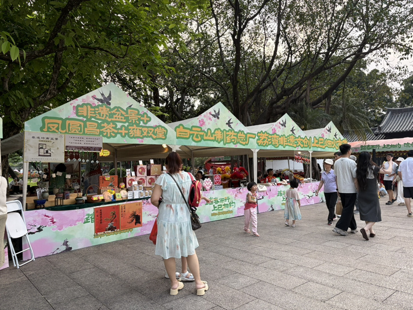 4月17日,船桨广场上的“三月三”上巳烟火市集红红火火开市,持续三天。荔湾多家老字号商家集中展销泮塘马蹄糕、荔湾艇仔粥、鸡仔饼等地道西关美食。泮溪酒家更推出以“泮塘五秀”为核心的春季套餐,大厨现场教游客制作时令点心,让市民亲手体验老字号的制作技艺。市集还延续民间“三月三,荠菜当灵丹”的说法,向游客免费派发荠菜煮鸡蛋,寓意去湿保安康。非遗文创摊位上,“泮塘五秀”元素的帆布袋、冰箱贴、茶点礼盒等节庆伴手礼颇受欢迎。