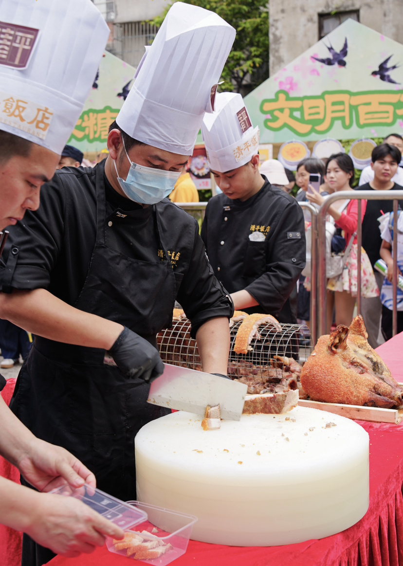 当天傍晚,船桨广场、五秀广场、梁家祠旁广场、大戏台前广场同时摆开圆桌,百余桌宴席沿水岸铺开。招财聚宝瑶柱羹、金凤报喜白切鸡、五福呈祥豉油鹅、年年有余珍珠斑、鸿运当头大红虾、锦绣前程炒丁粒、红皮赤壮烧金猪、节节高升富贵骨、生财添福扒花菇、福寿双全庆齐眉、碧绿常青靓菜心……每道菜都有好意头。