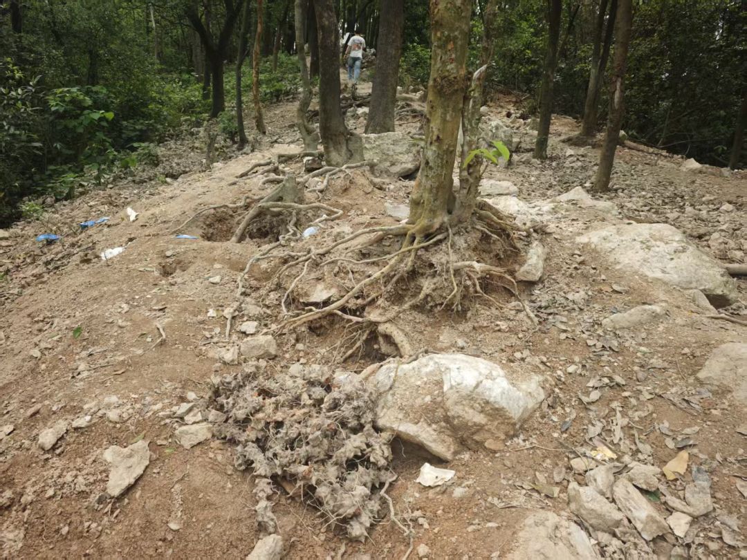 “挖水晶”导致山体裸露,个别树根裸露、地表出现孔洞
