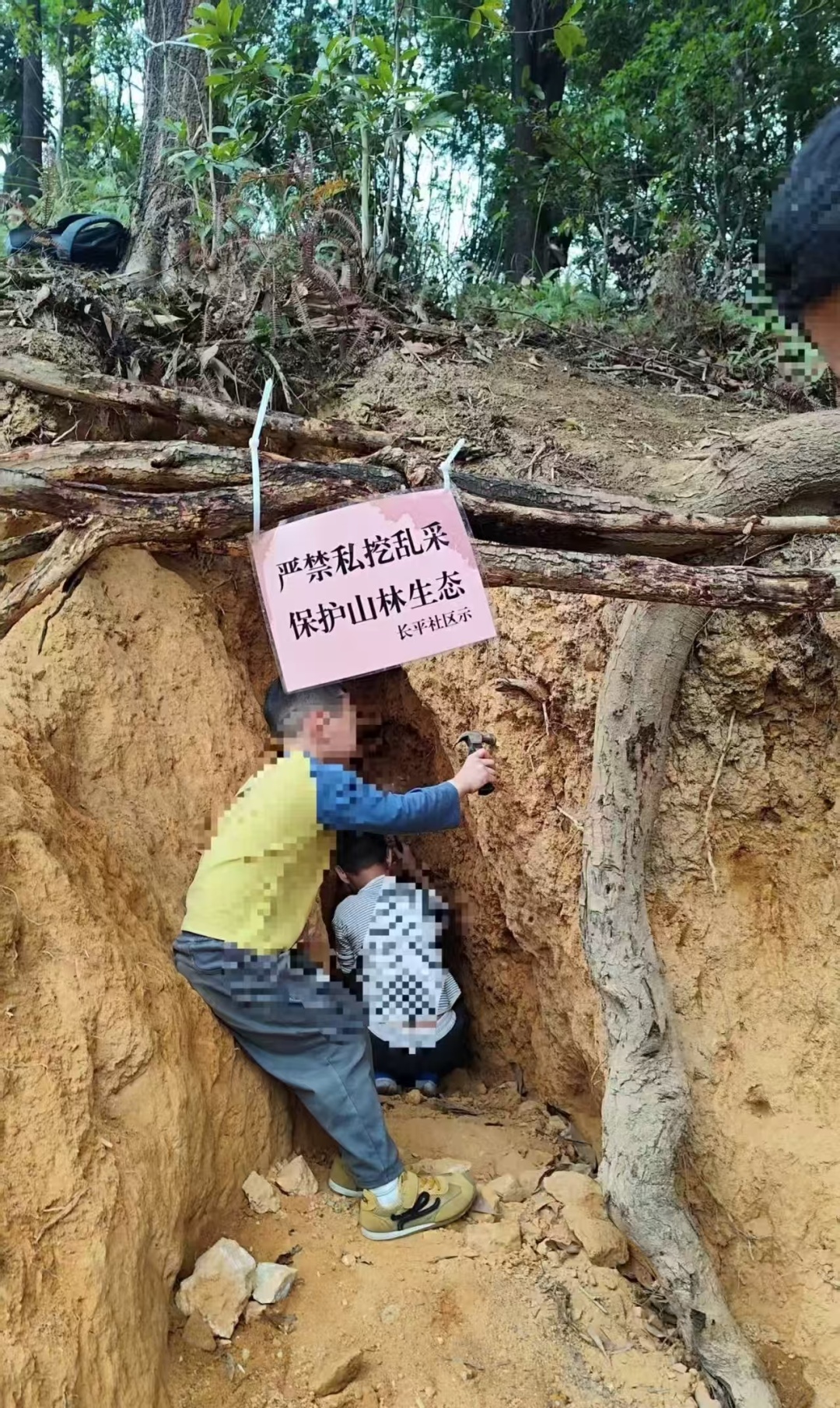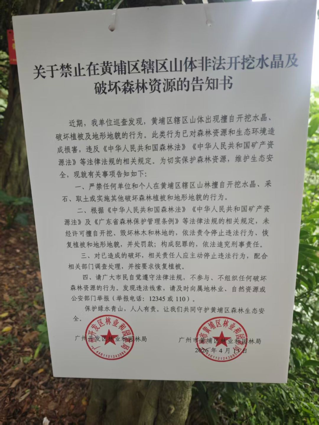 4月13日,黄埔区林业和园林局发出了《关于禁止在黄埔区辖区山体非法开挖水晶及破坏森林资源的告知书》,并与联和街道在沿途相关点位张贴告知书