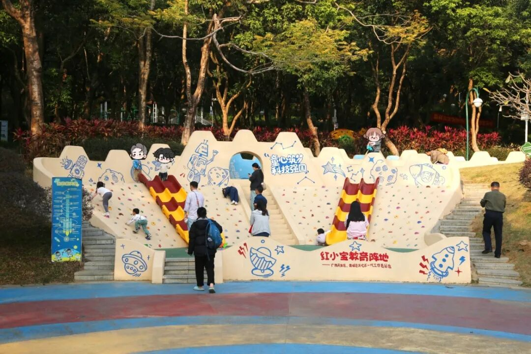 公园充分利用地形特点,巧妙打造了一条林中栈道,路灯和沿途的垃圾桶均被设计成生动有趣的植物造型,洋溢着浓浓的童趣。此外,公园内还设有“红小宝”主题阵地和儿童科普教育基地,融入中国梦航天梦等科技元素,让孩子们在游玩中增长知识。