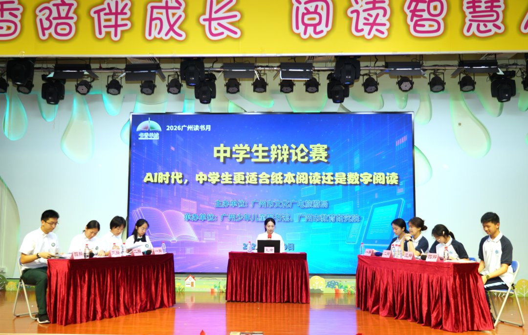4月19日下午,2026广州读书月之中学生辩论赛在广州少年儿童图书馆三楼报告厅拉开帷幕。本次辩论赛由广州市文化广电旅游局主办,广州少年儿童图书馆、广州市教育研究院承办,广东广雅中学、广州市第二中学、广州市玉岩中学、广州市培英中学的辩论队齐聚一堂,围绕“AI时代,中学生更适合纸本阅读还是数字阅读”这一辩题,展开了智慧与口才的精彩交锋。