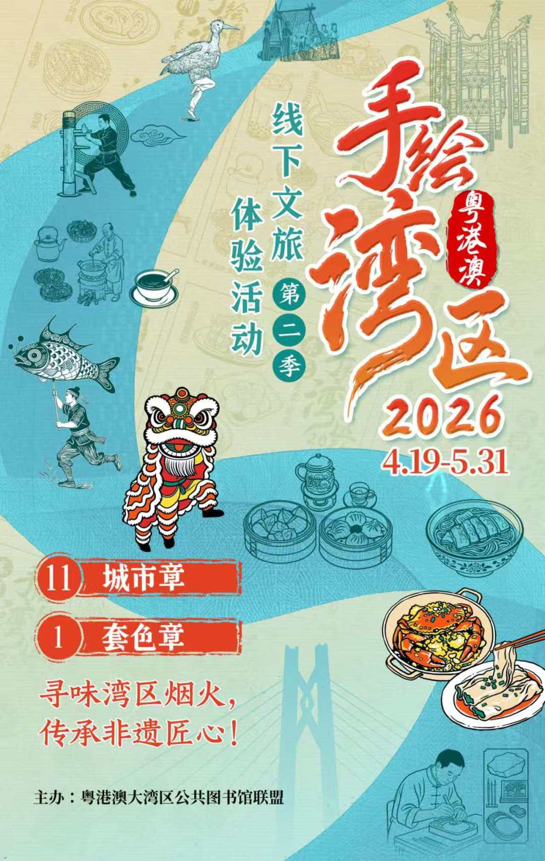 “一盅两件”里氤氲着老广州的烟火滋味,鱼灯舞中跃动着非遗风华……当湾区美食与非遗技艺融汇于方寸印章之上,一场跨越粤港澳三地的湾区文化之旅即将启程。2026年4月19日至5月31日,粤港澳大湾区公共图书馆联盟将联动“9+2”城市成员馆,重磅推出“手绘湾区”第二季线下文旅体验活动,以“寻味湾区·匠心传承”为主题,以“11+1”枚精心设计的“美食·非遗”手绘印章为载体,串联起大湾区的饮食风情与非遗底蕴,邀请市民读者通过集章打卡,品味烟火气,传承匠心。