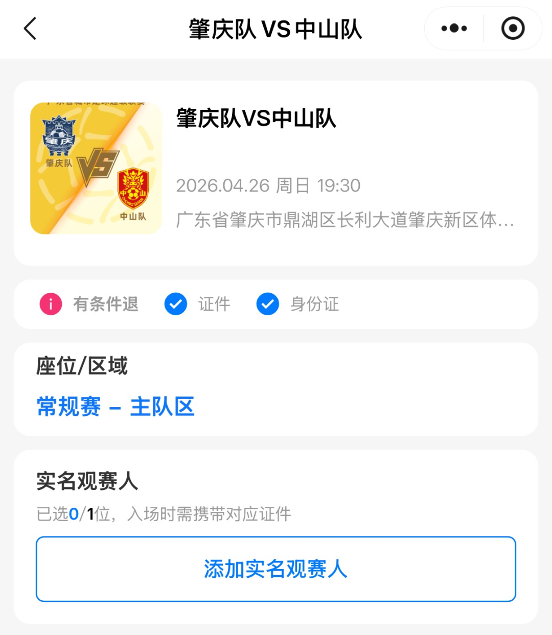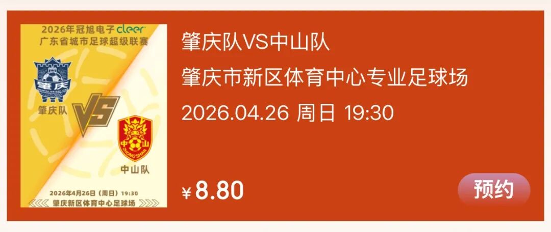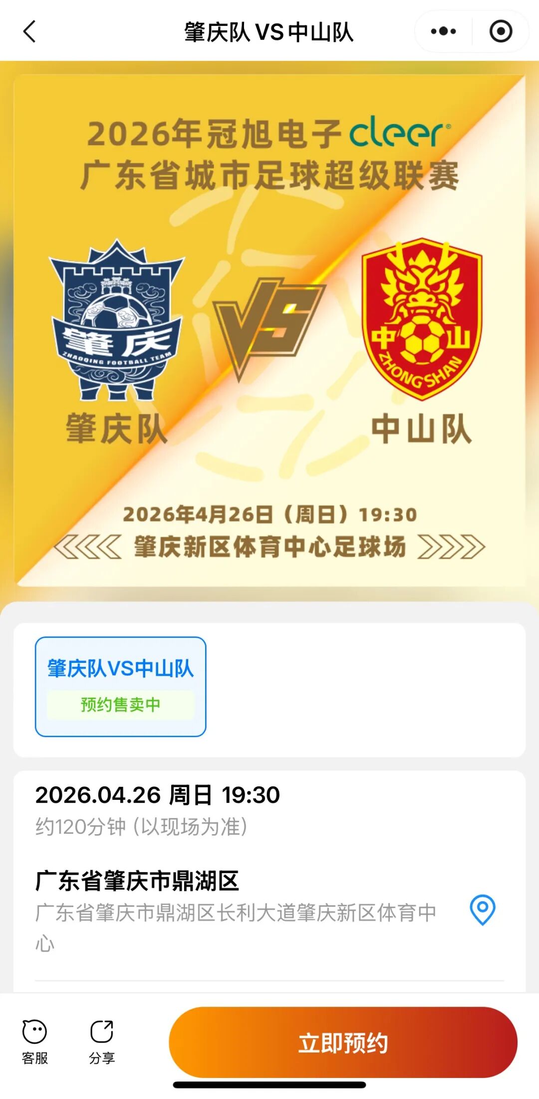 球迷需通过微信搜索“2026年广东省城市足球超级联赛”官方小程序,在小程序首页找到“肇庆队vs中山队”。
