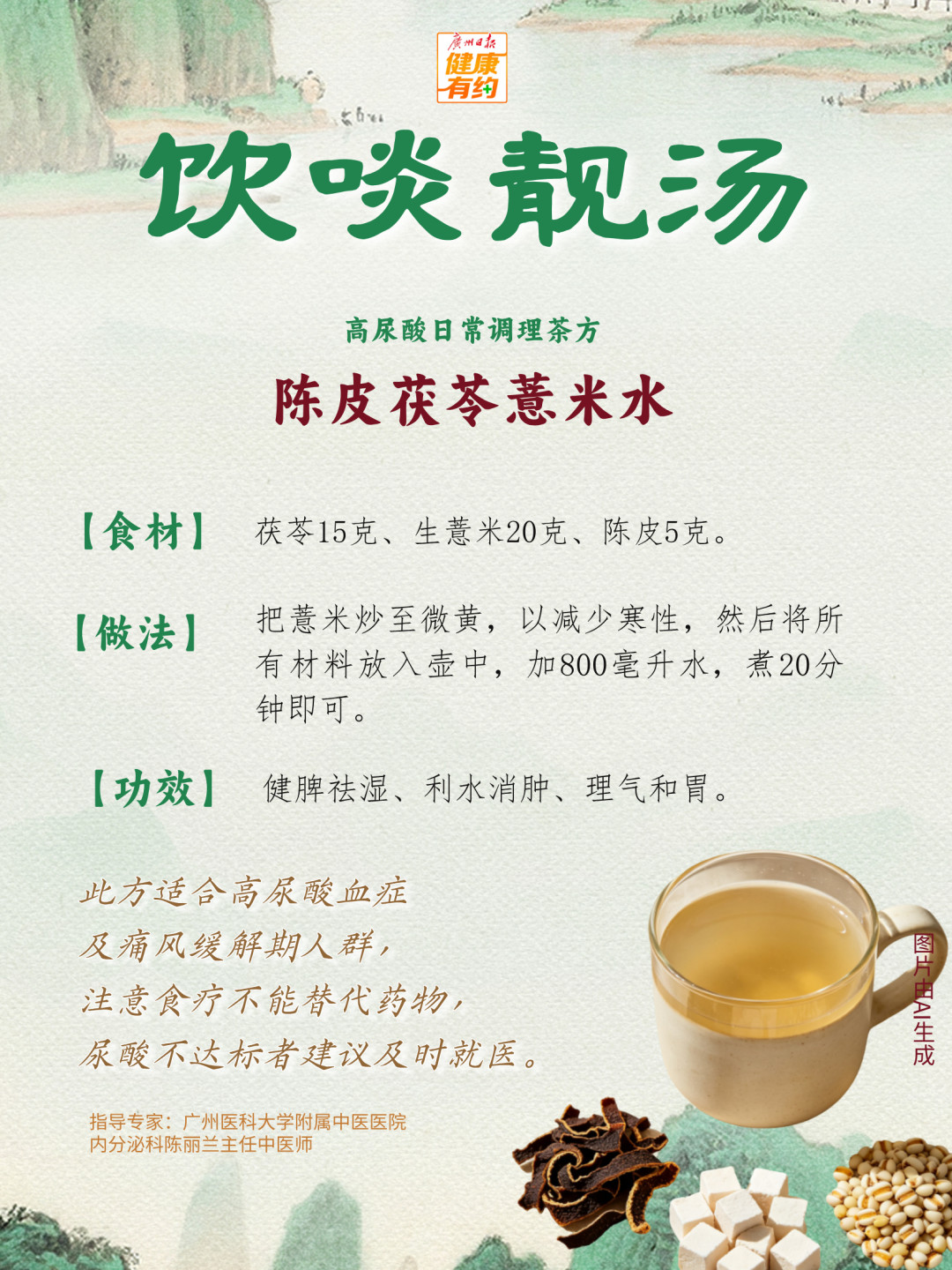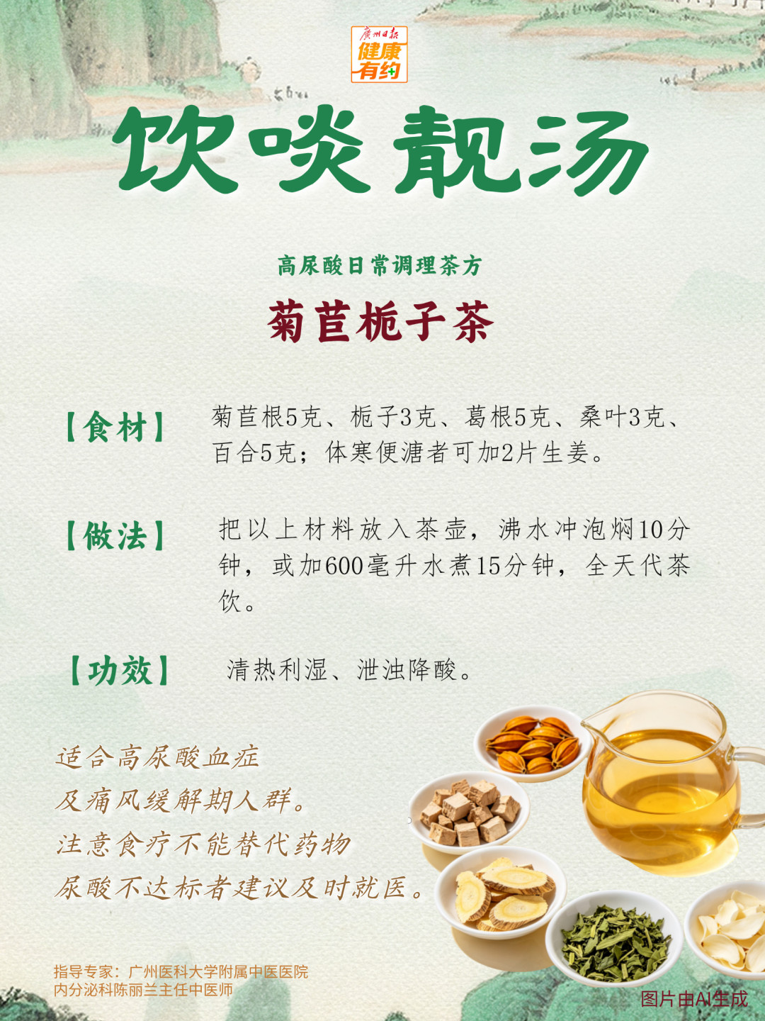 这里推了两道适合高尿酸人群日常调理的茶方。这些茶饮基于低嘌呤、促排泄原则设计,可操作性强,适合高尿酸血症及痛风缓解期人群。急性期建议遵医嘱。