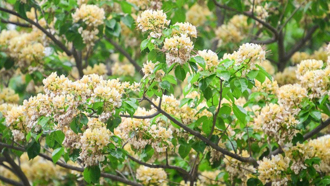 谷雨时节漫步广州,于细雨中与草木一同浸润。在公园绿地,花旗木繁花似锦,花瓣凝着剔透的雨珠,水汽氤氲着芬芳。美人蕉艳色欲滴,黄槐决明金蕊点点。鱼木花灿若黄金雨,风过处满目流光。 在乡间田野,楝花淡紫如雪,细碎满枝,引来彩蝶翩跹。二十四番花信风止,一季芳菲渐尽,岭南花事未央。