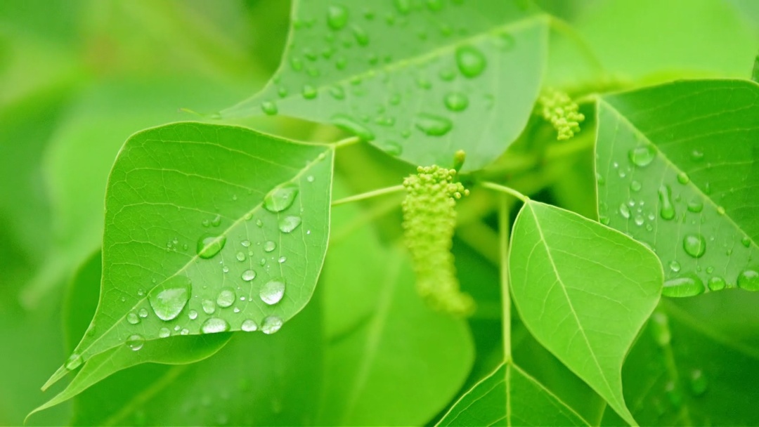 雨后的乌桕树,绿叶上凝着雨滴。