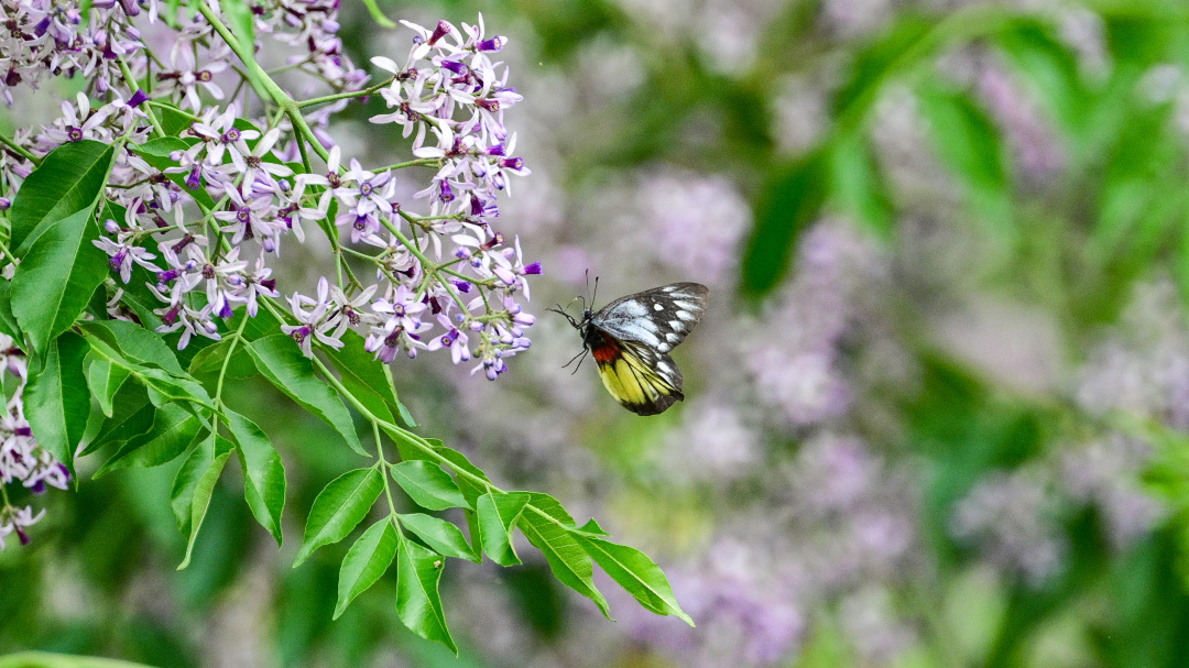 一只报喜斑粉蝶在楝花中采蜜。