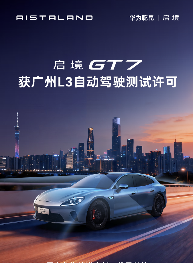 4月20日,记者从启境汽车方面获悉,启境GT7(测试车型:广汽AHC7000BEVW0D),正式获得L3级有条件自动驾驶道路测试许可,将在广州地区规定路段开展特定场景道路实测。