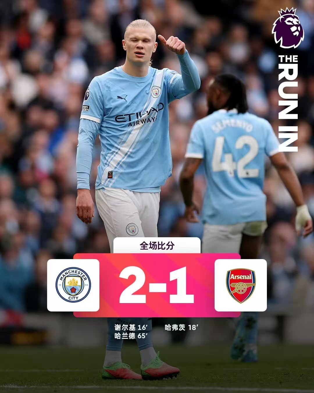 北京时间4月20日凌晨,2025—2026赛季英超第33轮结束了一场“天王山之战”,积分榜前两位的球队“狭路相逢”。结果,曼城主场以2比1战胜了阿森纳取得各赛事4连胜,阿森纳则迎来英超两连败。目前的英超积分榜上,阿森纳仍积70分位居榜首,曼城积67分位列第2,但少赛1轮。已经有数据公司根据余下5轮英超赛程等因素进行了分析,认为曼城夺冠的概率已经超过了阿森纳。不过,曼城主教练瓜迪奥拉则说:“我们重新看到了争冠希望,仅此而已”。本轮进球后以23球领跑本赛季英超射手榜的曼城前锋哈兰德也表示,不要多想,专注下一轮的比赛。