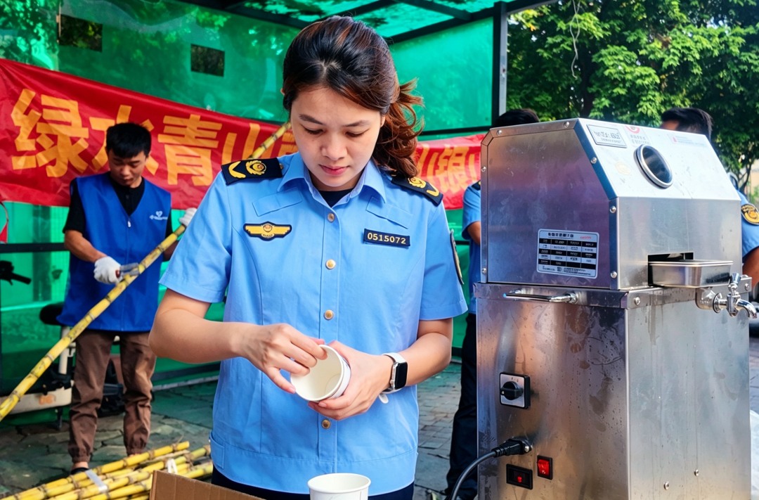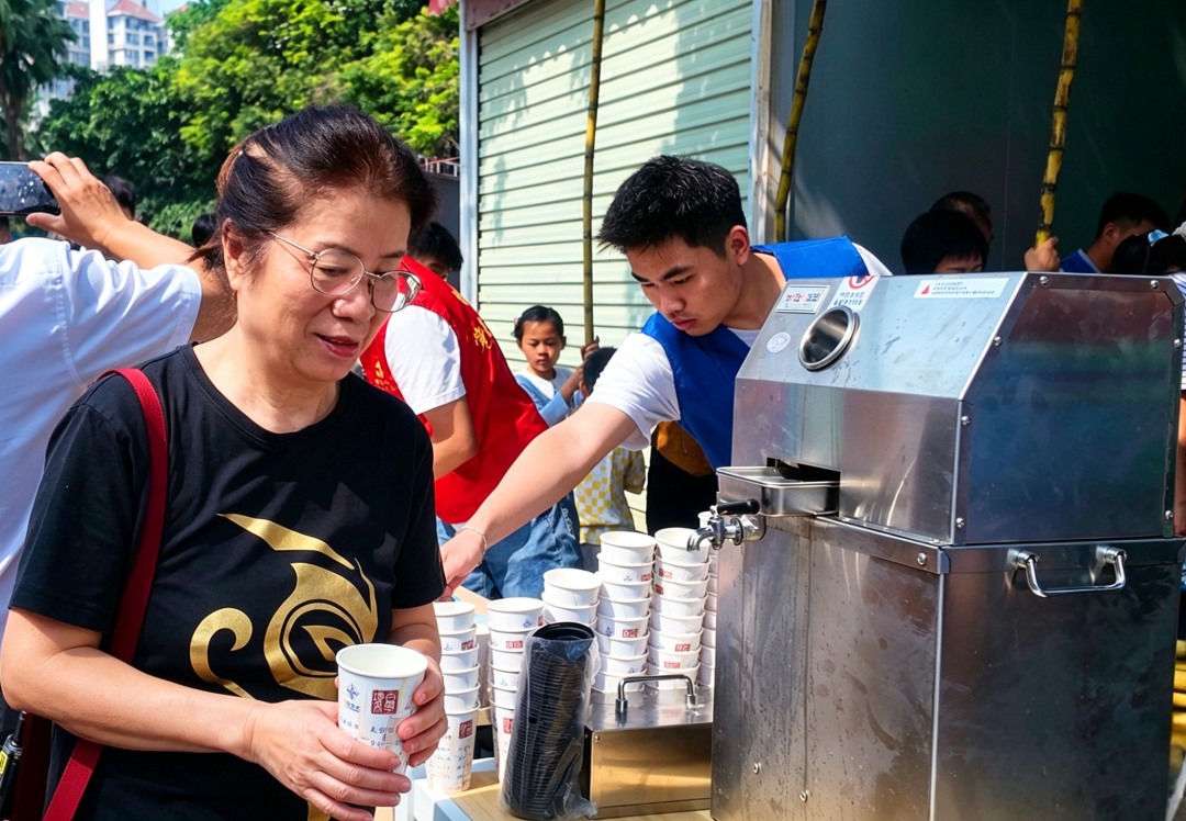 定制环保主题纸杯是本次活动的一大亮点,杯身印有涵盖垃圾分类、低碳出行等内容的顺口溜,居民饮用鲜榨甘蔗汁时可轻松熟记环保知识。活动特别采购南沙本地农户自产甘蔗,现场为居民提供削皮、榨汁服务,在温馨互动的氛围中,让环保宣传更具亲和力。