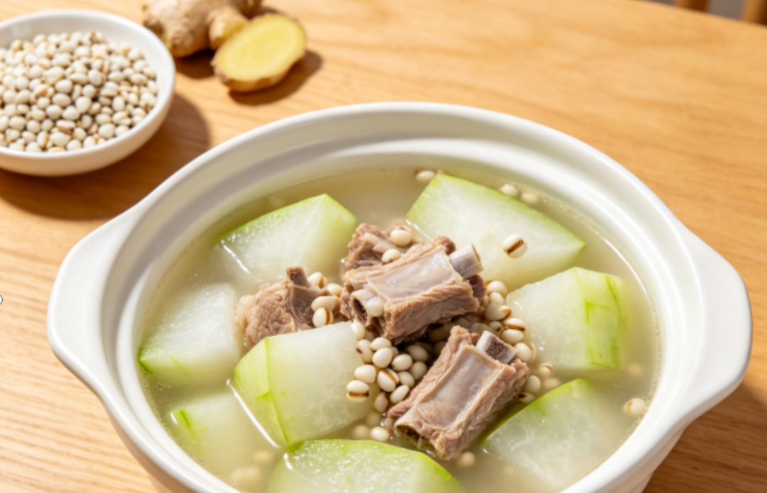 注意:急性痛风期去掉排骨,只用冬瓜、薏米、生姜煲水亦可。