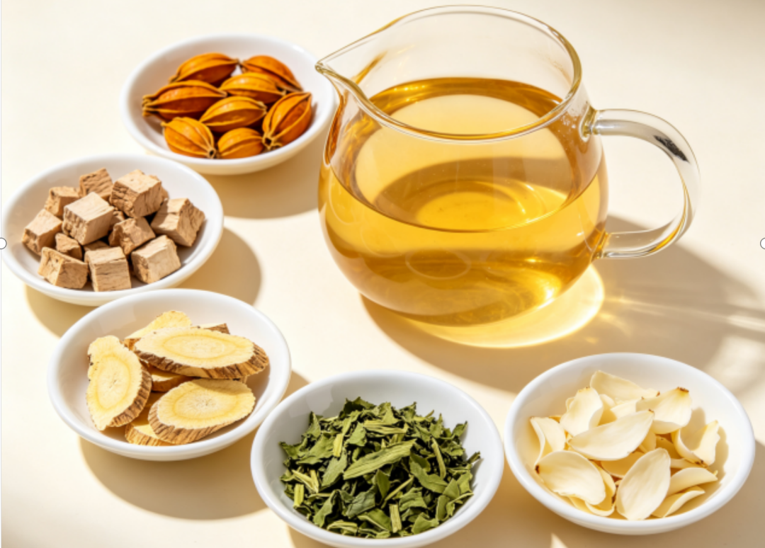材料:菊苣根5克、栀子3克、葛根5克、桑叶3克、百合5克;体寒便溏者可加2片生姜。