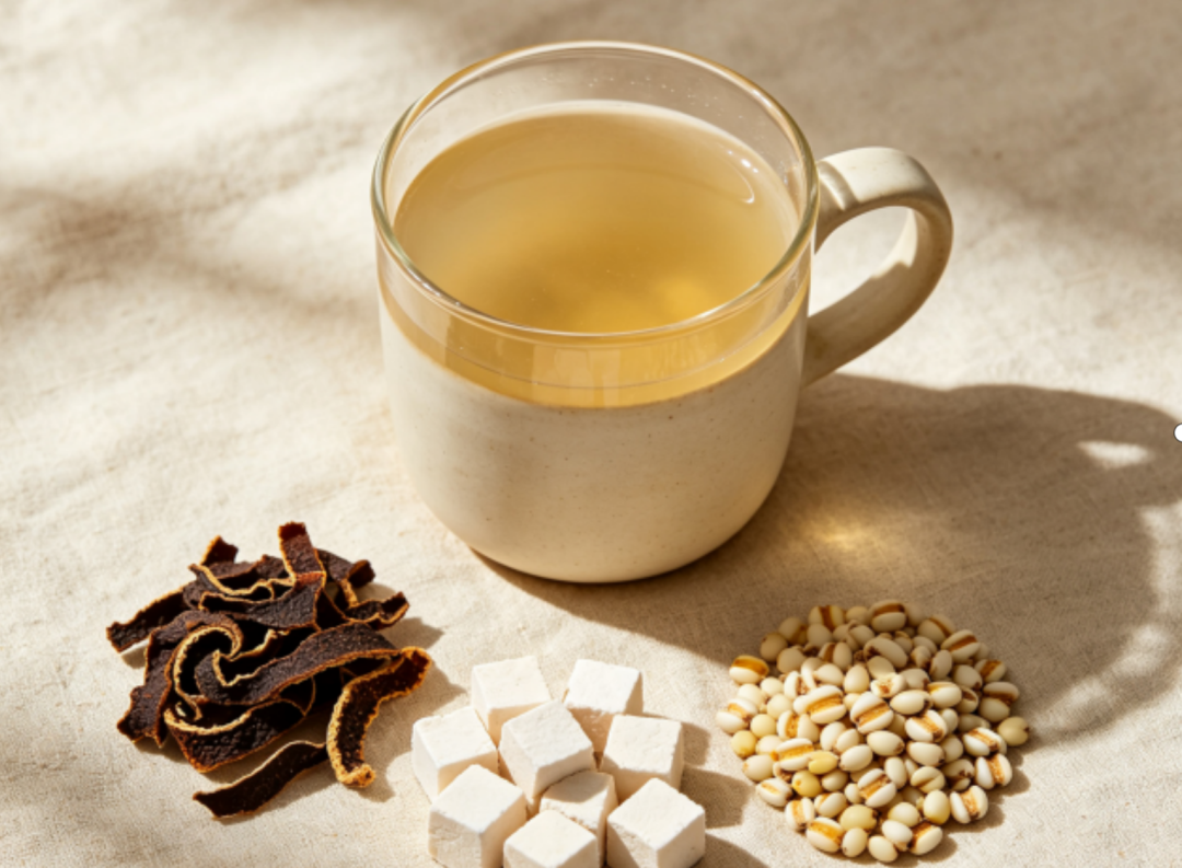 材料:茯苓15克、生薏米20克、陈皮5克。