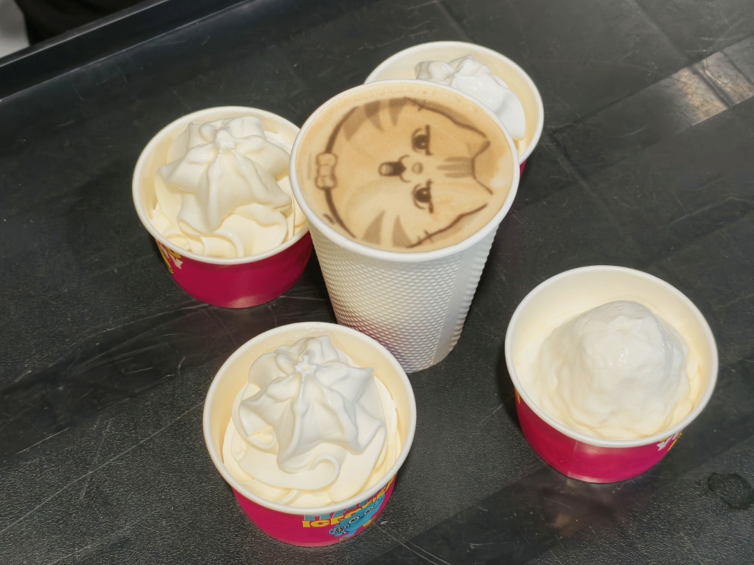 酷库的AI咖啡机器人制作的冰淇淋和咖啡。