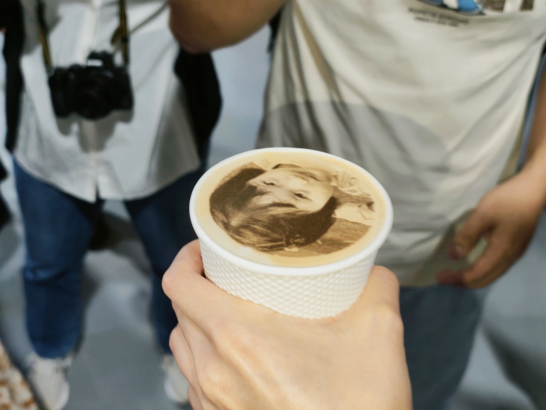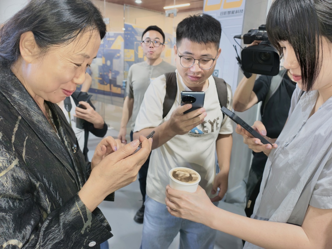 记者在拍摄AI咖啡机器人制作的冰淇淋和咖啡的过程。