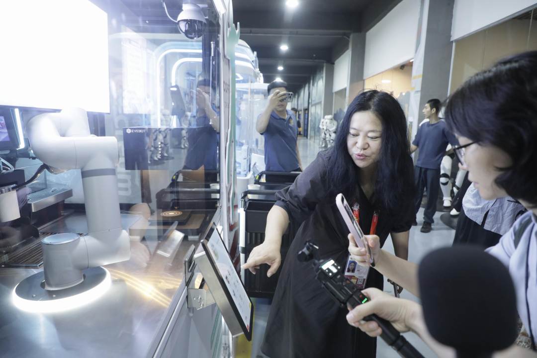 广东酷库智能机器人有限公司的CEO李彤向记者介绍酷库的AI咖啡机器人如何制作咖啡。