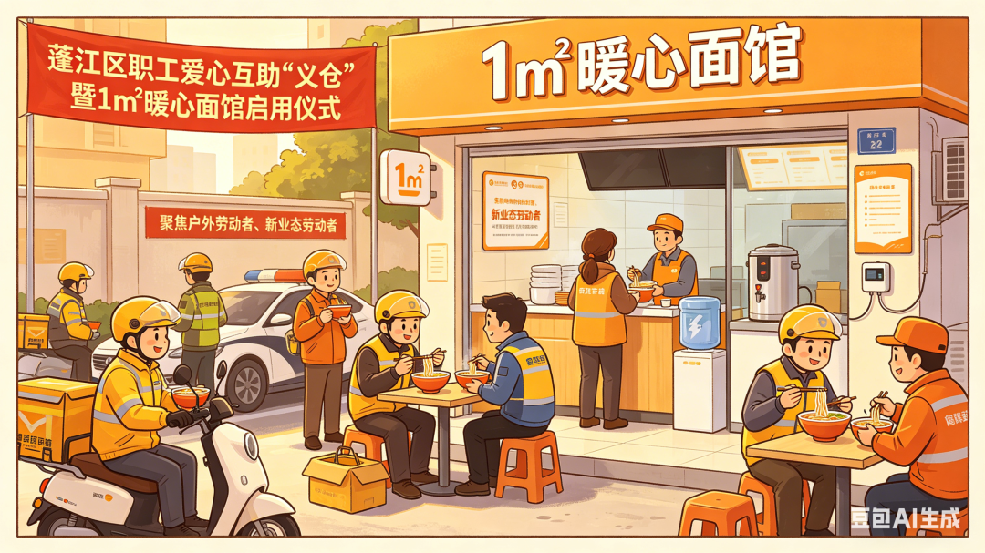 助力“幸福之城”建设,蓬江区职工爱心互助“义仓”及暖心面馆即将启用。(图由AI生成)