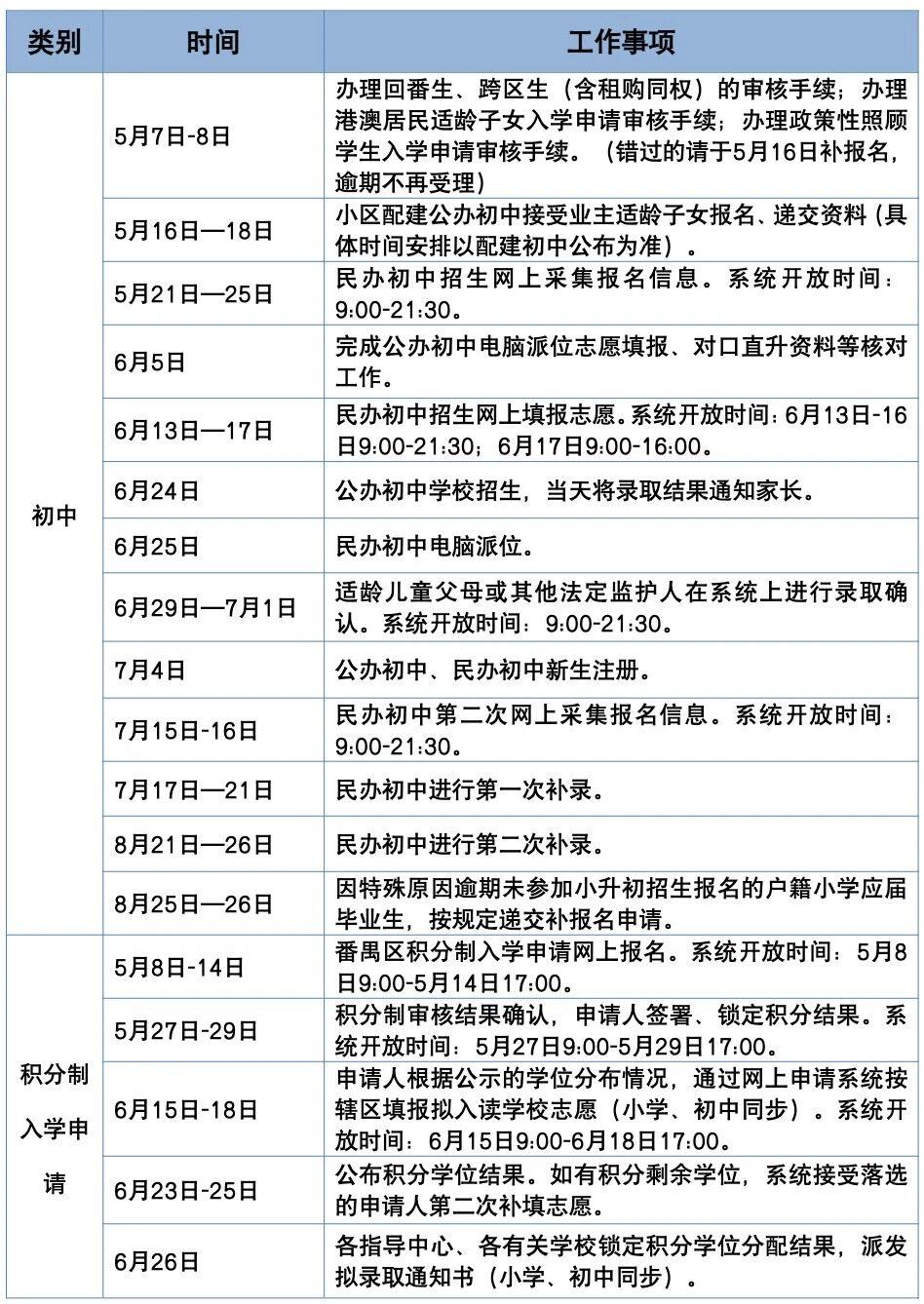 (一)5月7日—5月8日,回番生、租购同权学生、跨区入学学生、广州市政策性照顾学生及港澳居民适龄子女向属地教育指导中心申请入读初中一年级(错过的请于5月16日补报名,逾期不再受理)。