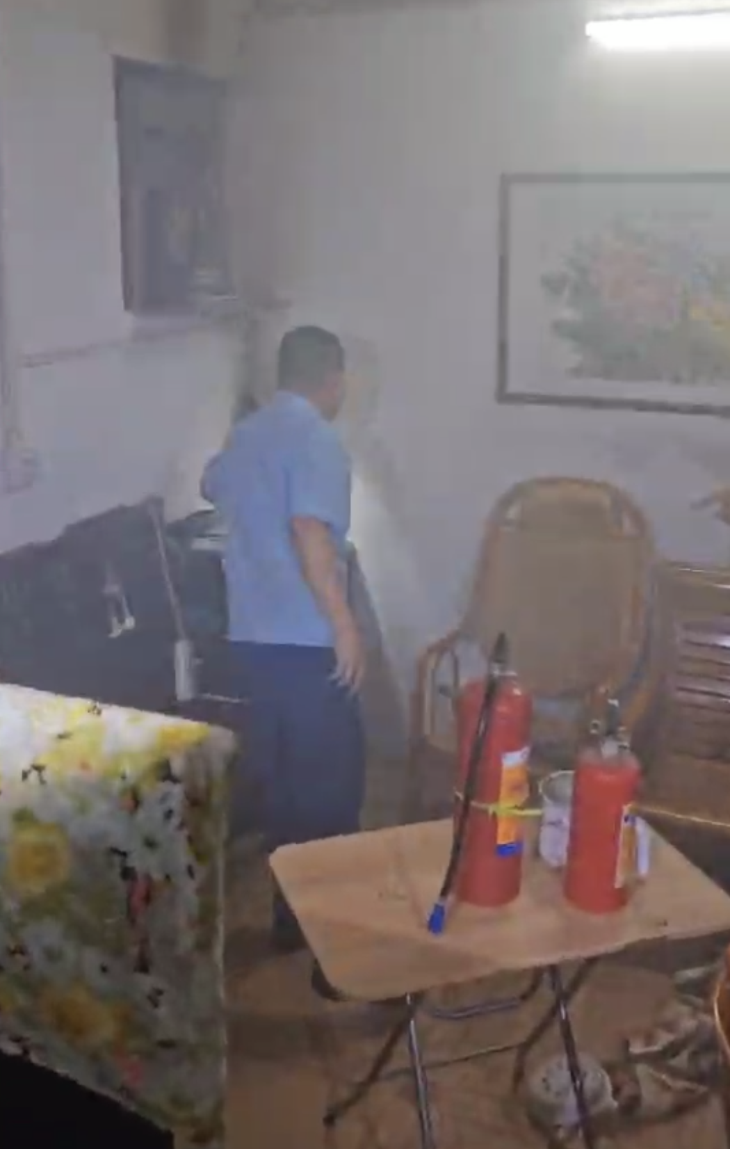 短短一分钟,沈建良率先抵达西城坊,网格员、志愿者也提着器材陆续赶到。此时,现场已能看到浓烈的浓烟从一栋居民楼的窗户中冒出,空气中弥漫着刺鼻的焦糊味。大家循烟望去,很快确认浓烟来自一楼街坊惠姨家,且房门紧闭。邻居们见状赶忙尝试联系惠姨,电话接通后得知,惠姨此刻正在返程的地铁上,家中无人,房门也已反锁,并无备用钥匙留存,这让现场所有人都捏了一把汗。就在众人焦急万分时,工作人员突然发现惠姨家一扇窗户没有关严,缝隙足以容许一名瘦小的成年人进入。“我来!”话音刚落,社区志愿者、群防群治队伍骨干明哥便自告奋勇站了出来,他是社区一名退役军人,身材瘦小、动作灵活,当即决定从窗户爬入屋内。社区网格员伍卓贲见状,立刻紧随明哥身后进入。刚进入房间,两人便被滚滚烟尘呛得直咳嗽,屋内能见度不足一米,浓烈的焦糊味扑面而来。凭借着日常应急演练积累的经验,他们很快锁定火源,浓烟正是从客厅的桌旁冒出,两人没有丝毫退缩,迅速拿出随身携带的灭火器,对准起火点奋力喷射。