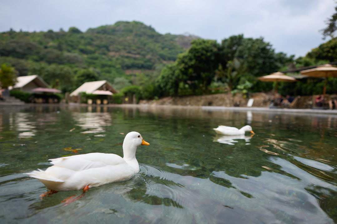品牌名字的由来,更是充满趣味。黄建彬和朋友在溪头村饲养了一只柯尔鸭,取名“丫头”。朋友打趣提议,不如就开一家“丫头咖啡”,话音落下,被黄建彬听成了“鸭头咖啡”。随性又鲜活,接地气又好记,这个独特的店名就此敲定。2024年5月,首家鸭头咖啡落地从化溪头村双水驿站,毗邻清溪与古水车,清幽静谧的山野环境,一经开业便迅速出圈,成为户外爱好者、都市青年争相打卡的山野咖啡店。