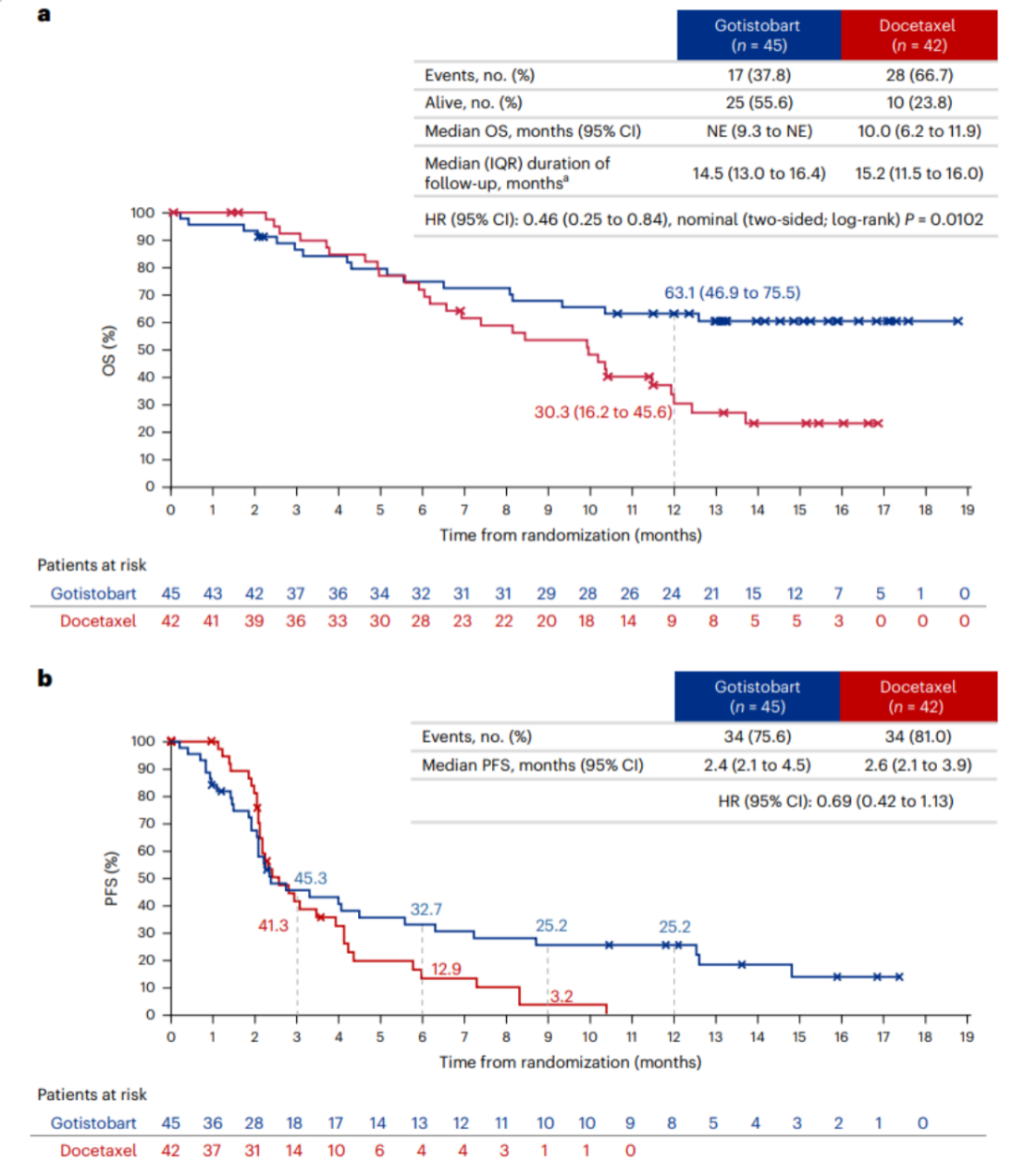PRESERVE—003第一阶段共纳入87例经一线PD—(L)1抑制剂联合含铂化疗后进展的转移性肺鳞癌患者,按1:1随机分配至新型CTLA—4抑制剂Gotistobart组(45例)或多西他赛组(42例)。经过14.5个月的随访,研究取得了突破性发现。