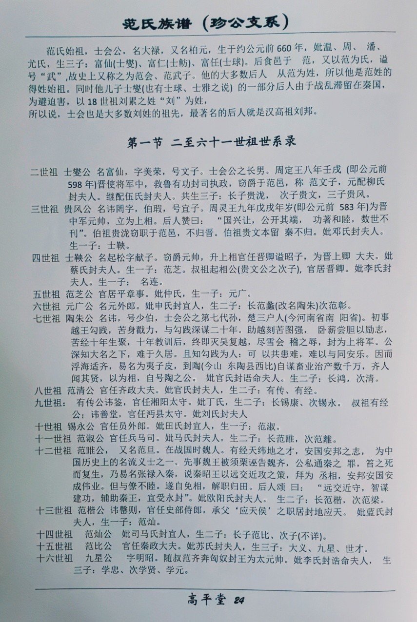 范家源远流长、根深叶茂,族谱记载自公元前660年始。