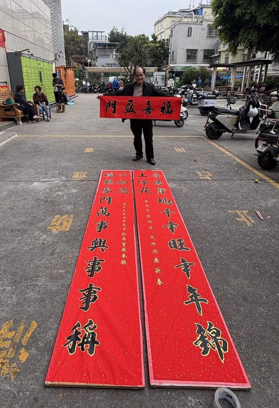 今年春节前夕,旭日大厦的住户又如期看到老范写的春联高高悬挂于大厦大门。今年春联的上联是:福照家门万事兴事事称心如意,下联是:喜居宝地千年旺年年锦上添花,横批:福喜临门。大堂张贴的“马到功成”“紫气东来”“福”等迎马年大红新年喜庆帖也是老范的手笔。穿梭出入的邻居喜气均沾,大家纷纷向老范道谢,老范眉开眼笑:“我2001年入住旭日大厦,2002就开始为大厦写春联,一晃二十多年过去啦!”