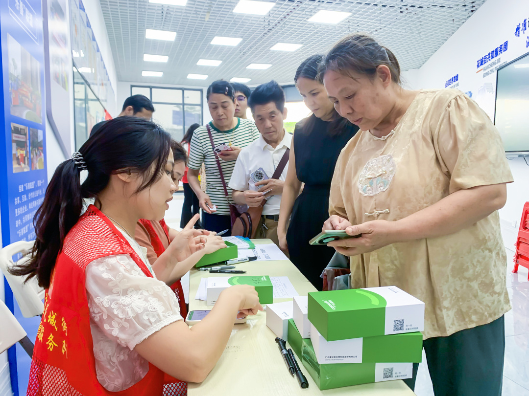 在花都区花城街杜鹃社区,志愿者向居民发放大肠癌基因筛查采样盒。