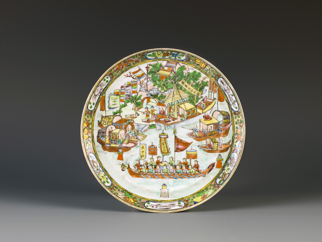 清光绪广彩绘海珠炮台龙舟图盘(图源:广东民间工艺博物馆)