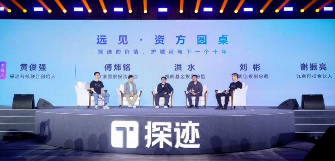 在资方圆桌环节,软银愿景投资总监傅炜铭、凯辉基金投资总监洪水、启明创投副总裁刘彬、九合创投合伙人谢振亮同台对话。这四家机构均是探迹多轮融资的参与者,有的已陪跑近十年。