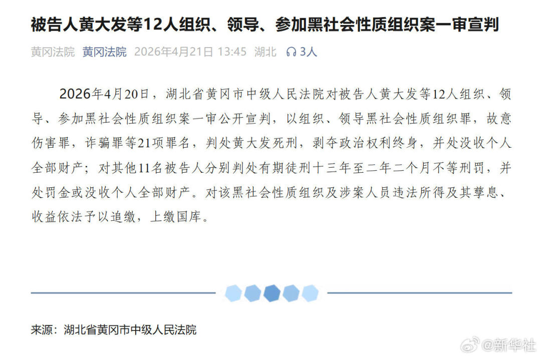 2026年4月20日,湖北省黄冈市中级人民法院对被告人黄大发等12人组织、领导、参加黑社会性质组织案一审公开宣判,以组织、领导黑社会性质组织罪,故意伤害罪,诈骗罪等21项罪名,判处黄大发死刑,剥夺政治权利终身,并处没收个人全部财产;对其他11名被告人分别判处有期徒刑十三年至二年二个月不等刑罚,并处罚金或没收个人全部财产。对该黑社会性质组织及涉案人员违法所得及其孳息、收益依法予以追缴,上缴国库。