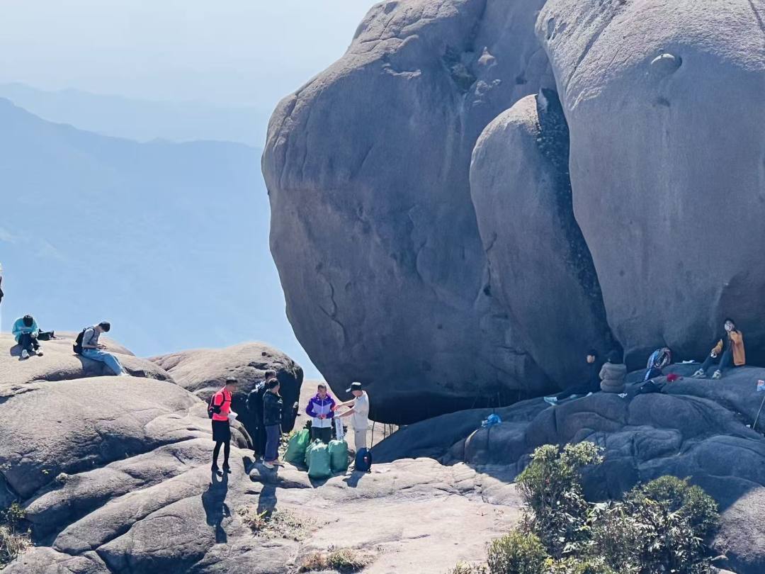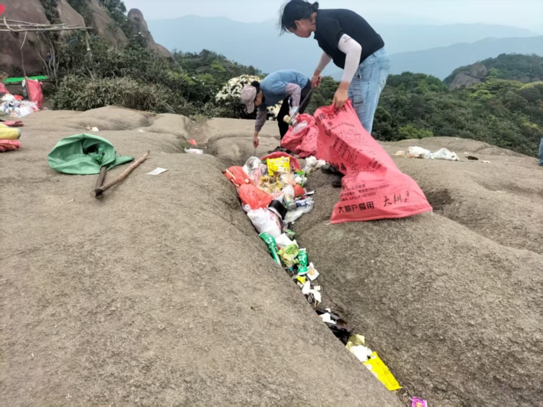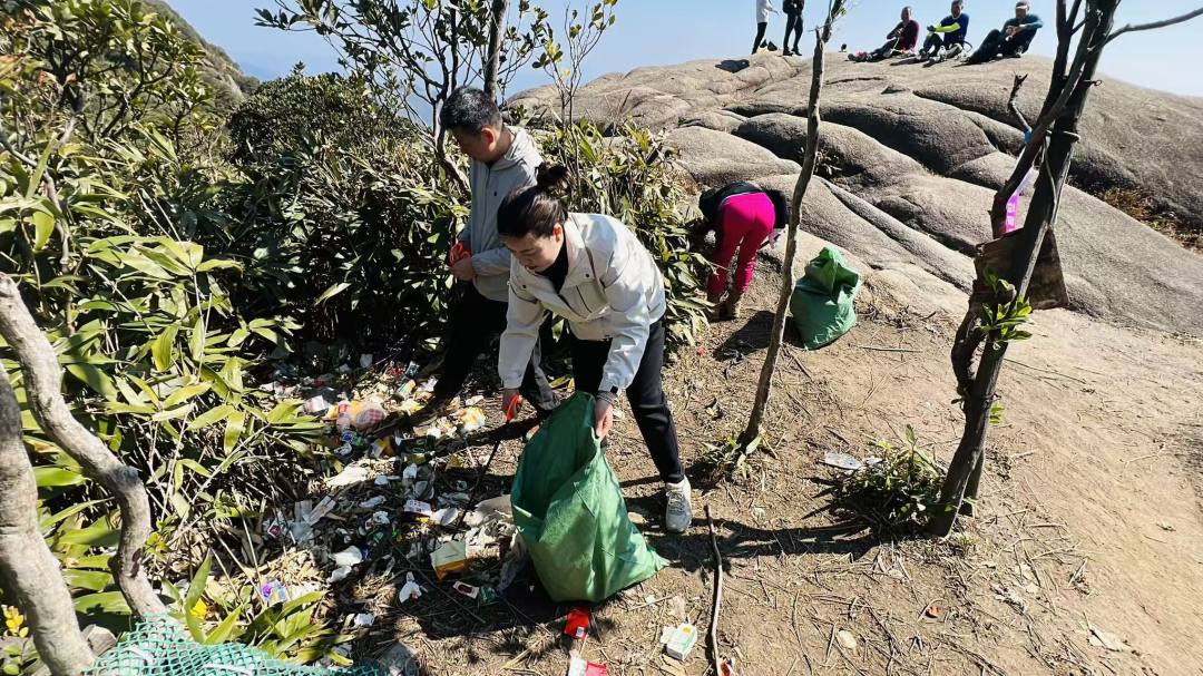 参与者中有一位社会志愿者,是四五十岁的大姐,手还有点残疾,背了两大袋下来。牛牯嶂山下的几个村的团干部特别积极,说村里吃的就是山上的水,活动中还有几人受了擦伤和刮伤,下来之后他们用碘伏擦了一下,都说小问题。女生们下了山说自己连滚带爬的,爬山还要背一袋垃圾真的很难很重,但是大家都咬牙坚持了下来。