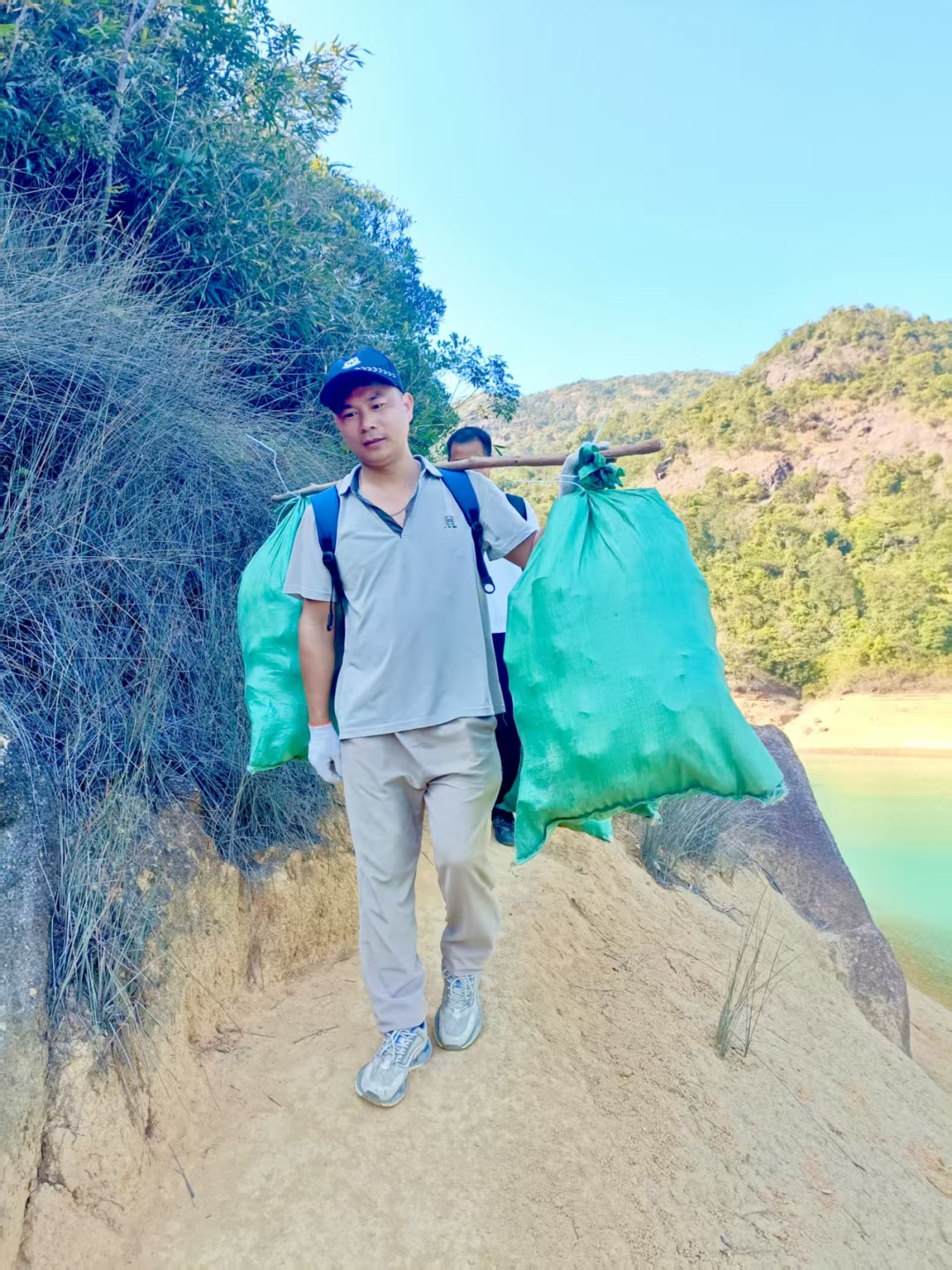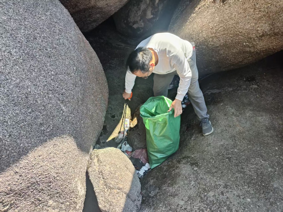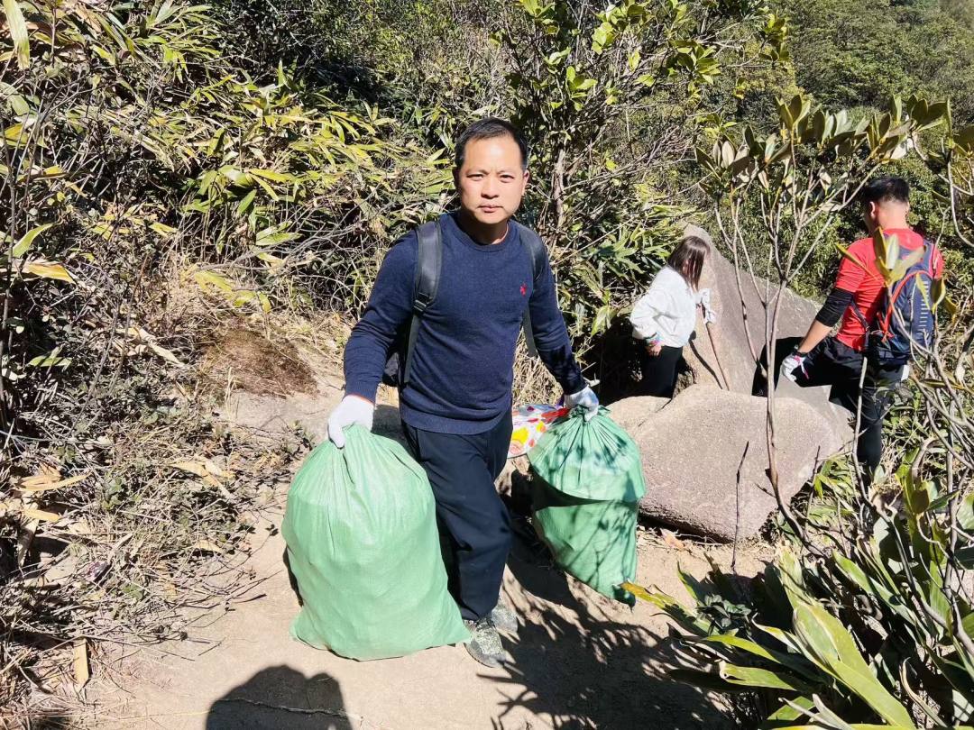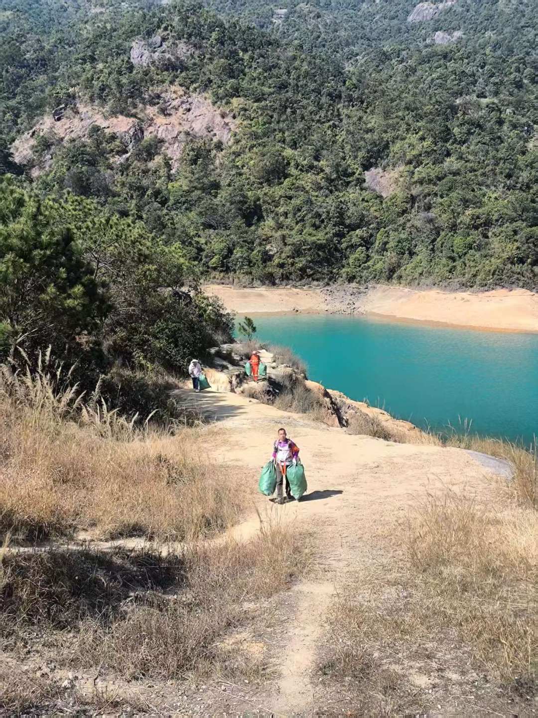 活动当日清晨,参与者在大猪兜水库旁集结。领队介绍了活动流程,并讲解登山安全须知与垃圾分类规范。随后进行热身,避免运动损伤。大家精神抖擞,明确分工,手持清理工具,化身“绿色卫士”,深入步道沿线、草丛石缝,仔细搜寻并捡拾被丢弃的塑料瓶、包装袋、食品残渣等各类垃圾。不惧山路崎岖,不畏辛劳,相互协作,有的负责夹取,有的负责撑袋,有的负责搬运,忙碌的身影成为山间一道亮丽的风景线。