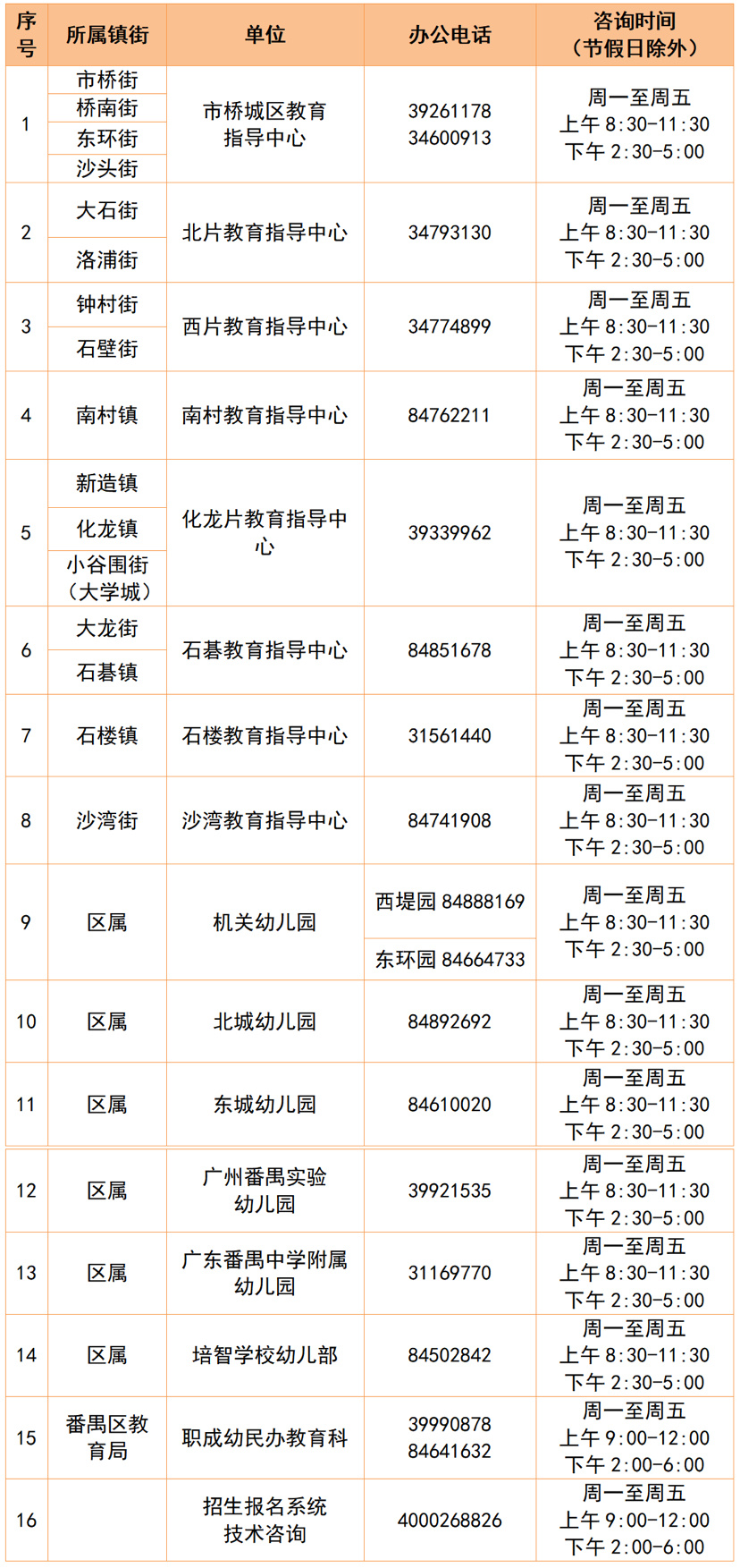 番禺区各镇街、区属幼儿园招生工作单位及咨询电话一览表