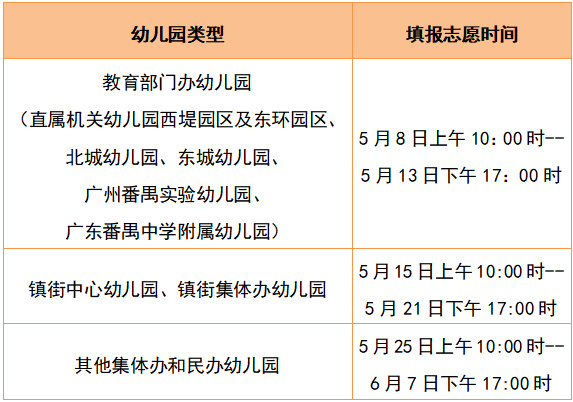 教育部门办幼儿园采取网上报名(含PC端和移动端)的方式进行,其中番禺区户籍适龄子女报名时间为5月8日10:00—5月13日17:00;政策性照顾人员子女报名时间为5月8日10:00—5月12日17:00;番禺区直属机关幼儿园、广东番禺中学附属幼儿园除上述情况外,符合其他报读条件的,填报志愿时间为5月8日10:00至5月12日17:00。