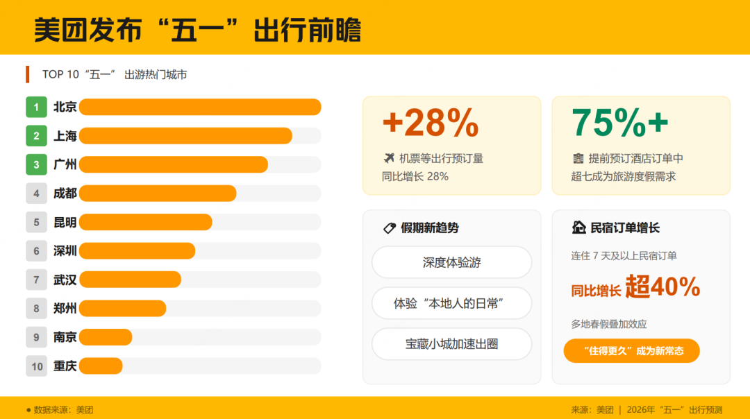 “五一”假期临近,国内出行热度持续攀升。4月21日,美团发布数据显示,“五一”期间,机票等出行预订量同比增长28%。叠加多地春假等因素,“住得更久、玩得更深”的深度体验游成为假期新趋势。数据显示,在所有提前预订的酒店订单中,超过七成来自旅游度假需求,连住7天及以上的民宿订单量同比增长超过40%。
