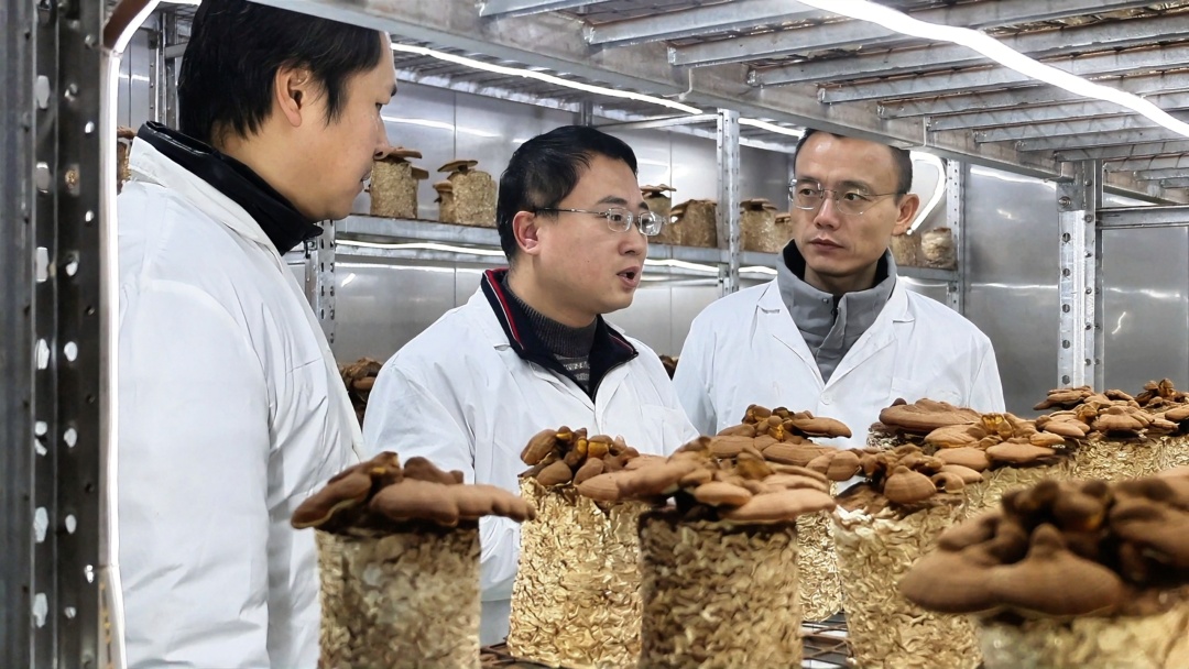 援疆工作队廖鑫等人在菌仓检查灵芝生长情况。