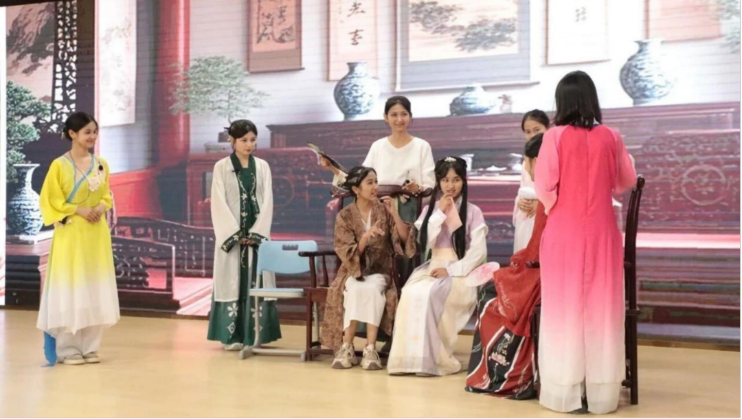 红楼梦话剧社正在进行表演的学生。