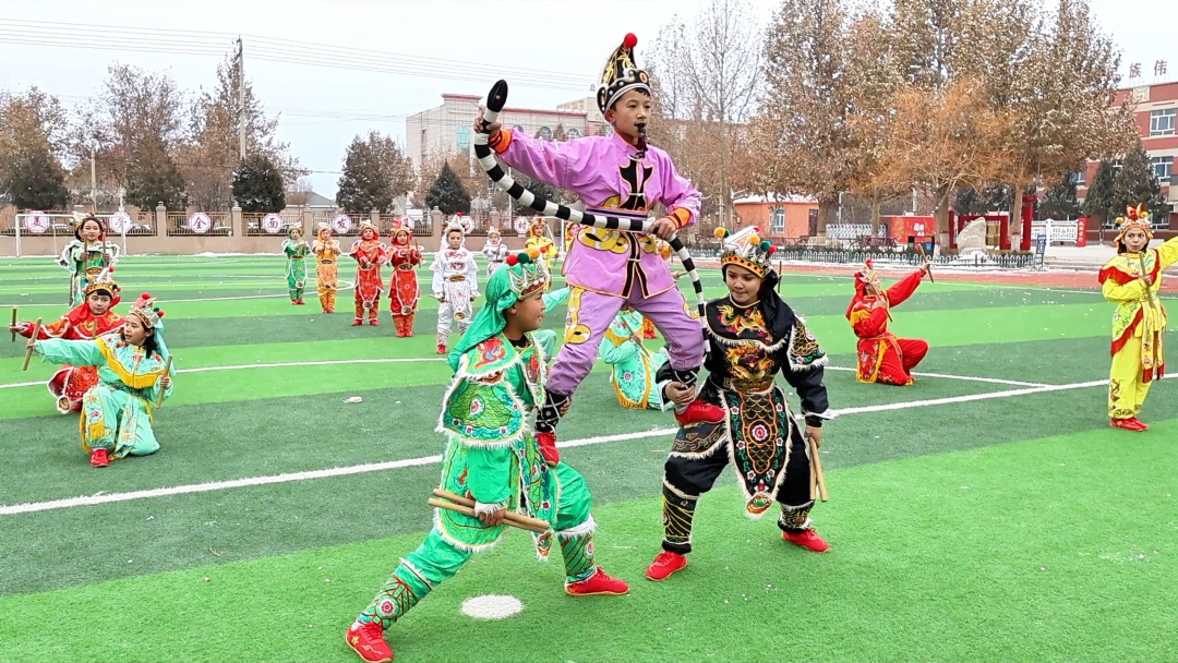 疏附县明德小学的学生正在表演英歌舞。