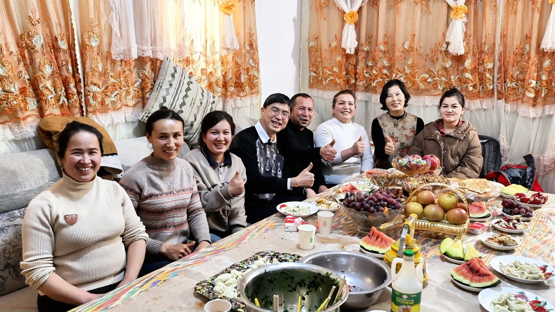 第十批广州援疆工作队队员与结亲户吐尔洪江一家包饺子、庆佳节。
