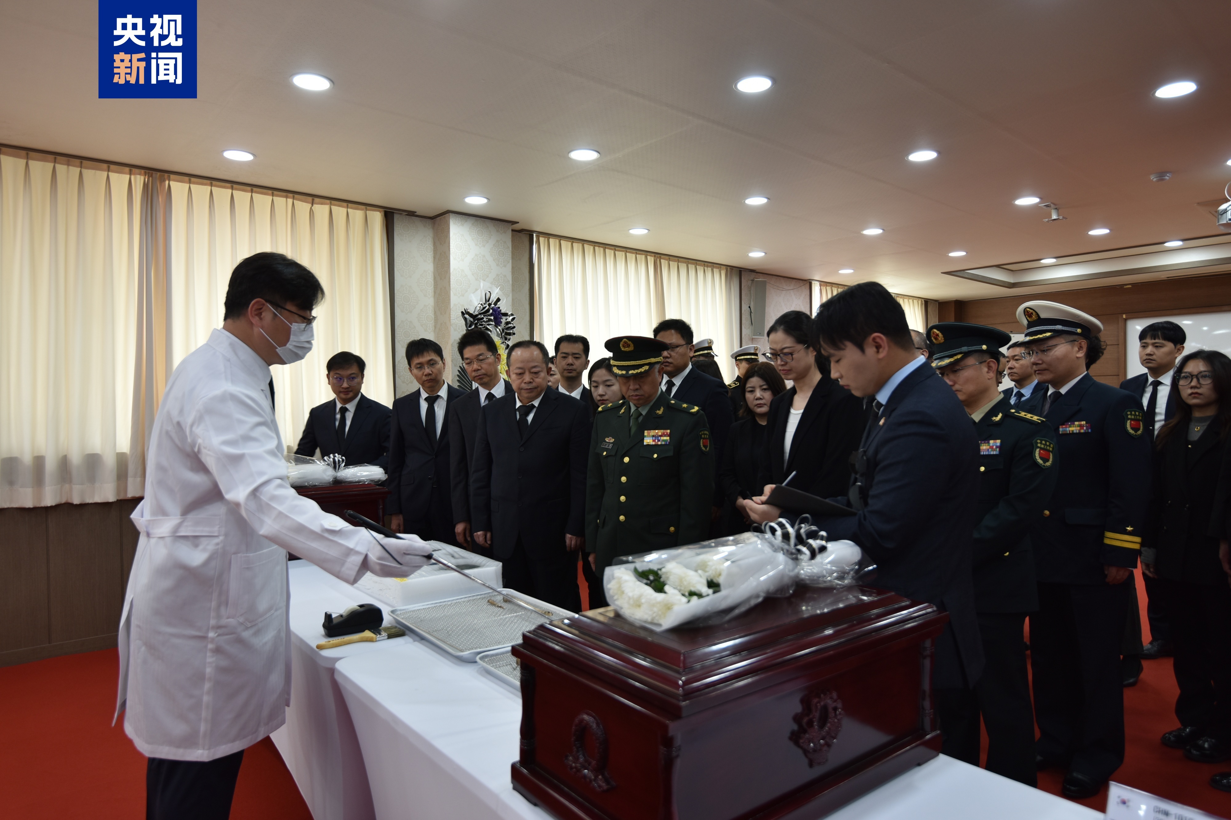 退役军人事务部、中央宣传部、中央对外联络部、中央网信办、外交部、国家发展改革委、财政部、军委政治工作部等军地有关部门组成的中方交接代表团组全体人员、中国驻韩国大使馆相关人员共同见证迎接志愿军烈士回家。