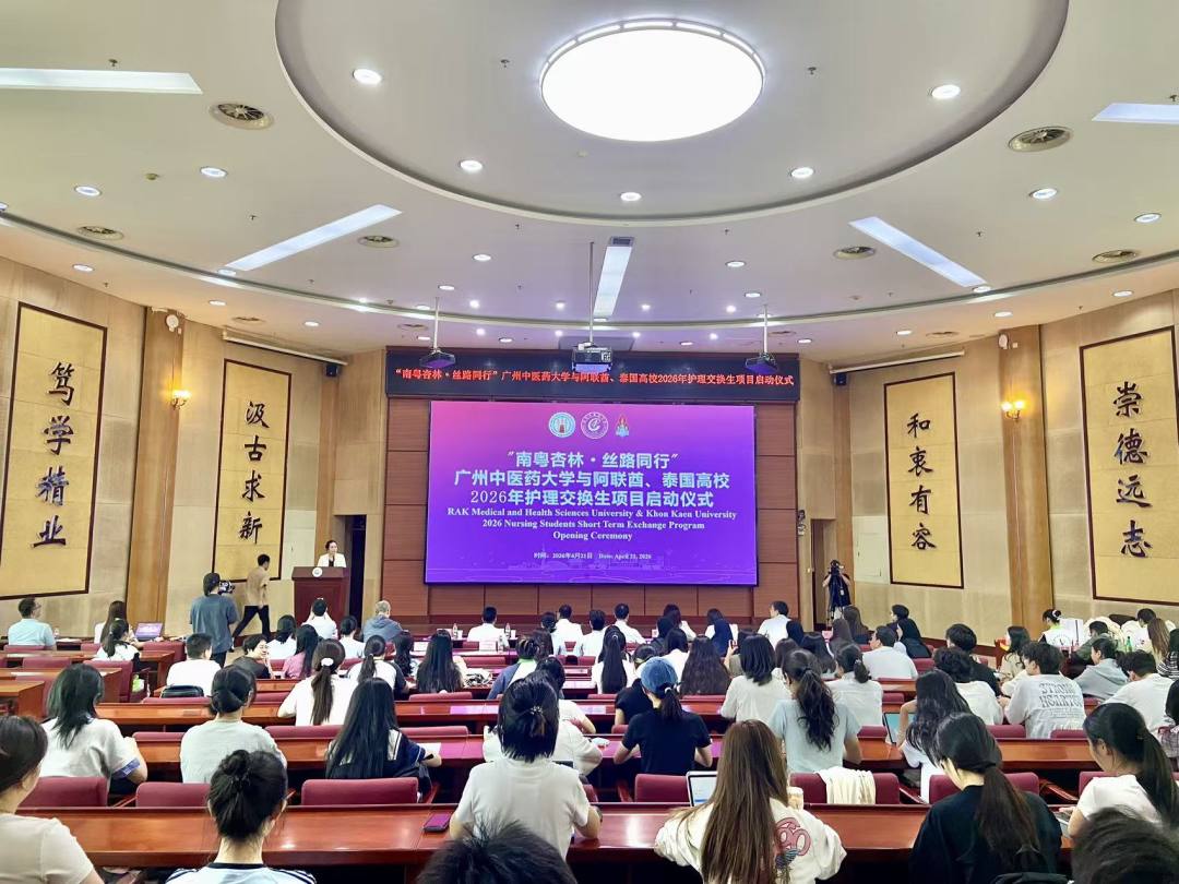 4月21日,“南粤杏林・丝路同行”广州中医药大学与阿联酋、泰国高校2026年护理交换生项目启动仪式在广州中医药大学(以下简称“广中医”)大学城校区举行。来自阿联酋哈伊马角医药与健康科技大学、泰国孔敬大学的师生代表与广中医齐聚一堂,共同开启跨国护理教育交流新篇章。