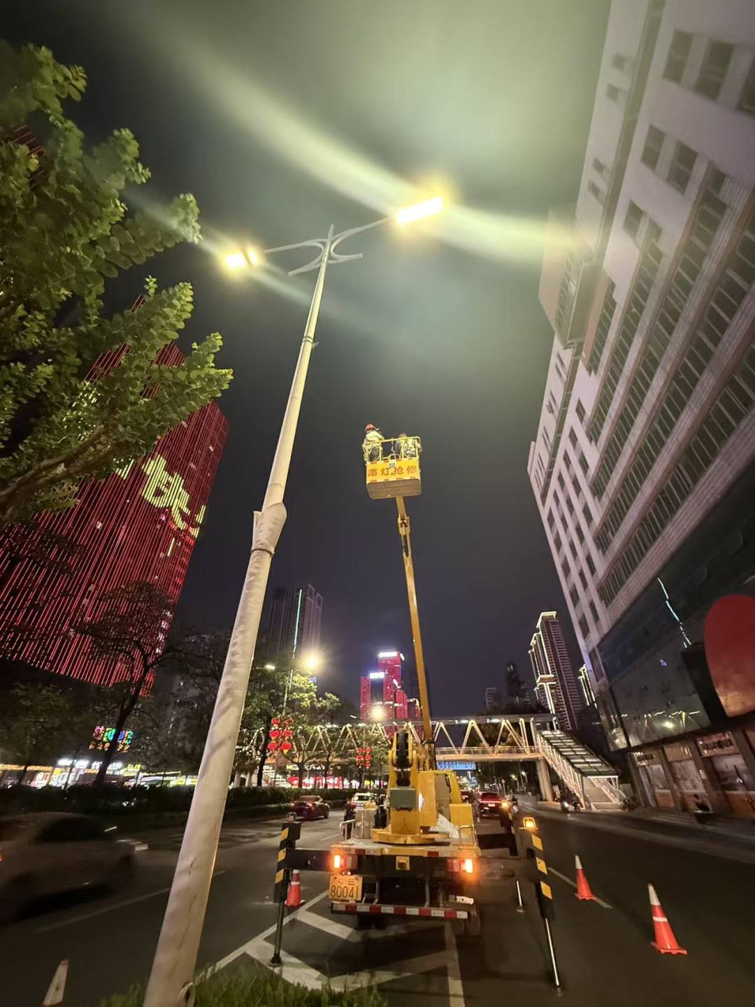 季华六路是禅城核心交通要道,串联起商圈、住宅与政务配套,既是市民日常通勤的关键路段,也是展示城市风貌的重要窗口。近年来,随着地铁站点落地、平安中心、高端商住楼盘等配套建筑陆续投用,沿线人流车流持续增加,路口及出入口不断扩容。原有路灯设施老化、光照强度不足等问题日渐突出,不仅影响市民夜间通行体验,还存在道路通行安全隐患,成为群众迫切期盼解决的民生难题。