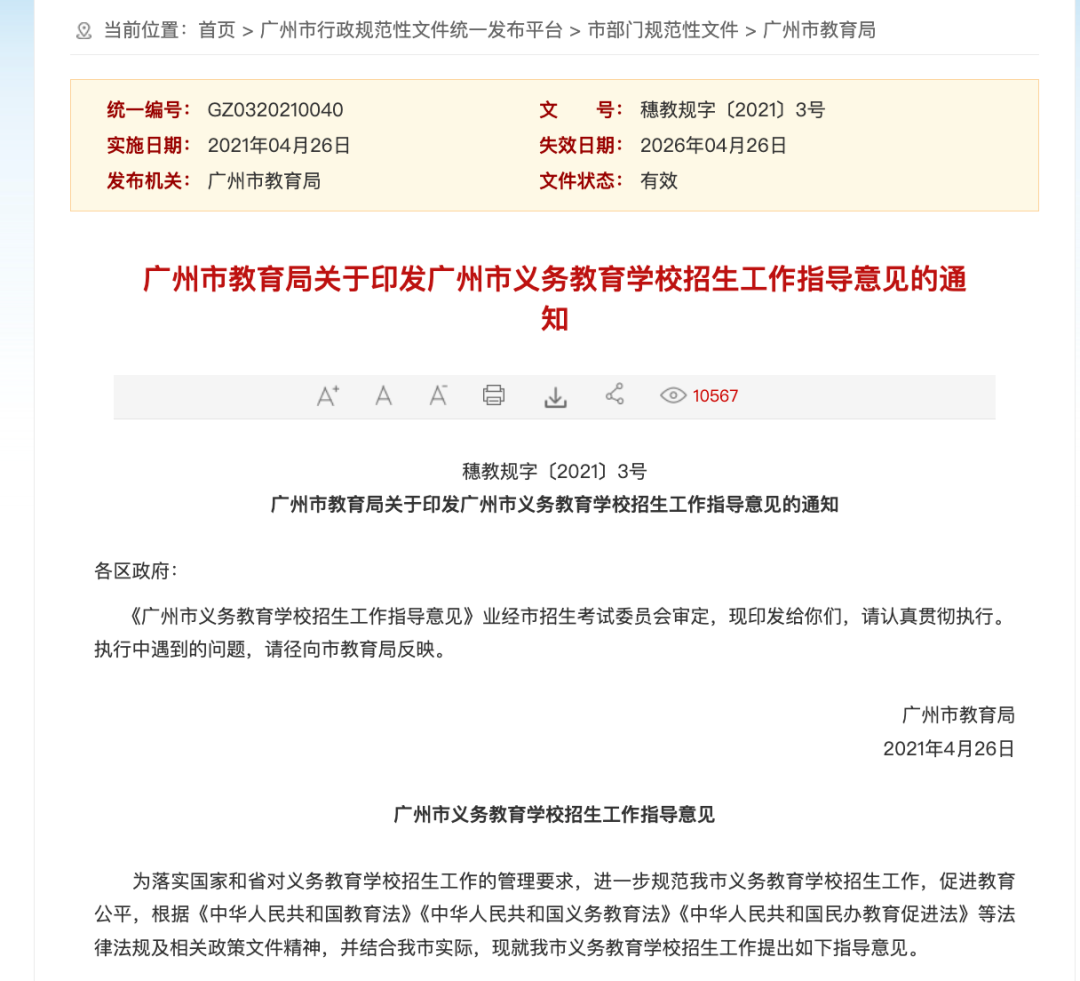 2021年4月,广州市出台《广州市义务教育学校招生工作指导意见》