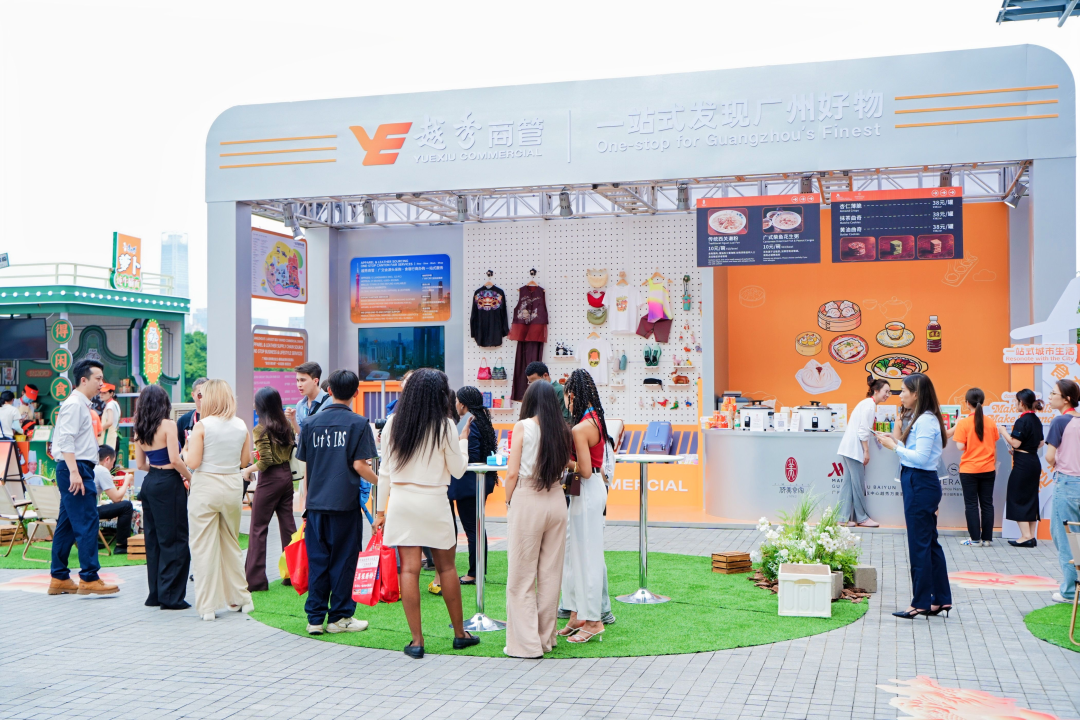 在广交会展馆D区,越秀商管打造了“悦聚·欢迎大厅”,作为广交会音乐美食节“食在广州”嘉年华的核心服务载体。该空间联动白马服装市场、中港皮具城等专业市场的原创品牌,以及优衣库、超级安踏、风行牛奶等品牌,集中展示融合广府文化的服饰、箱包、特产等特色产品,吸引境内外客商驻足品鉴与洽谈。